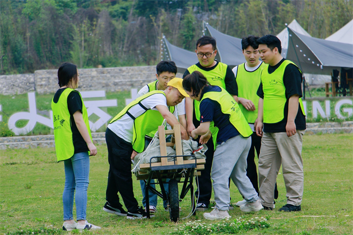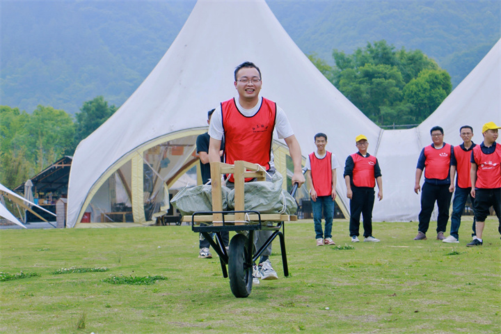 独轮车运物资也是红色团建的重要体验项目。在崎岖不平的道路上,推着独轮车运送“物资”,看似简单,实则充满挑战。独轮车不好控制平衡,一不小心就可能导致“物资”掉落。这就需要参与者集中注意力,掌握好技巧,同时还要有足够的体力和耐力。