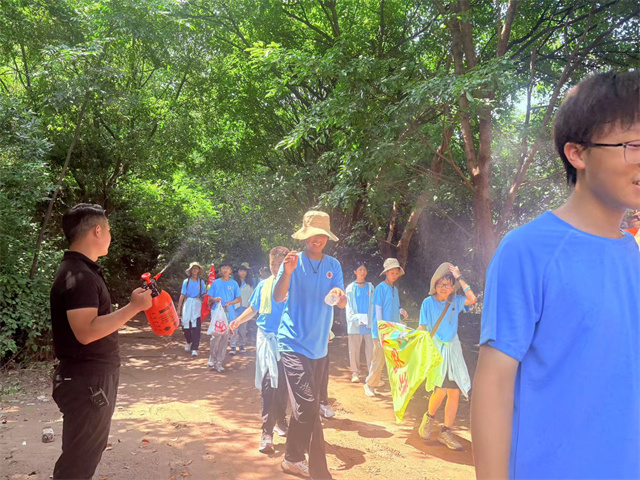 沿途中,为了防止学生们中暑,安排了工作人员在途中为他们喷水降温,及时补水,确保他们在舒适的状态下完成行程,全程保护孩子们的安全,沿途配备了专业队医,全程跟随,时刻关注学生们的身体状况。